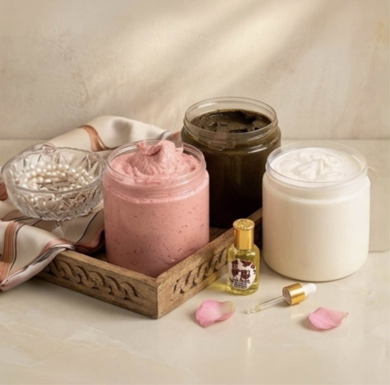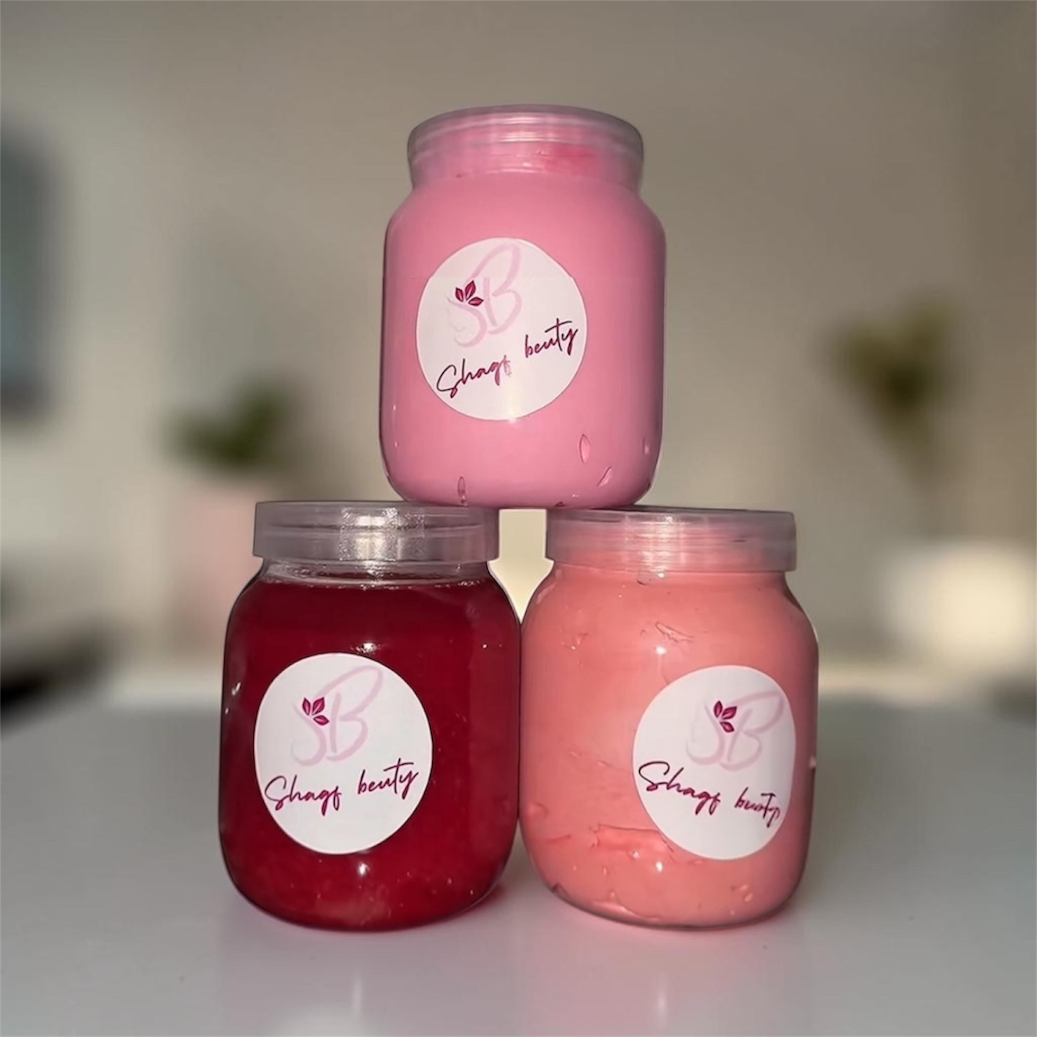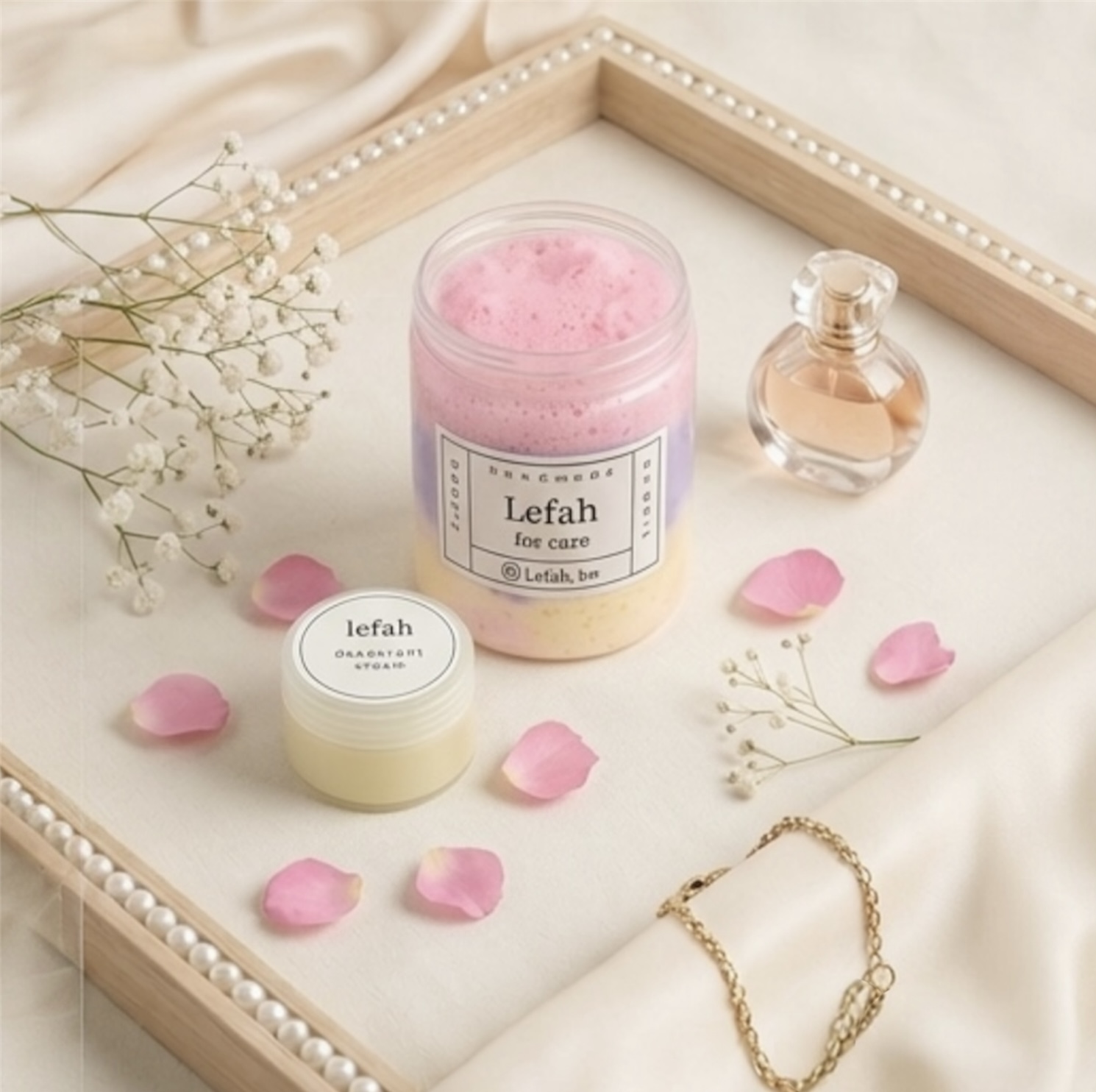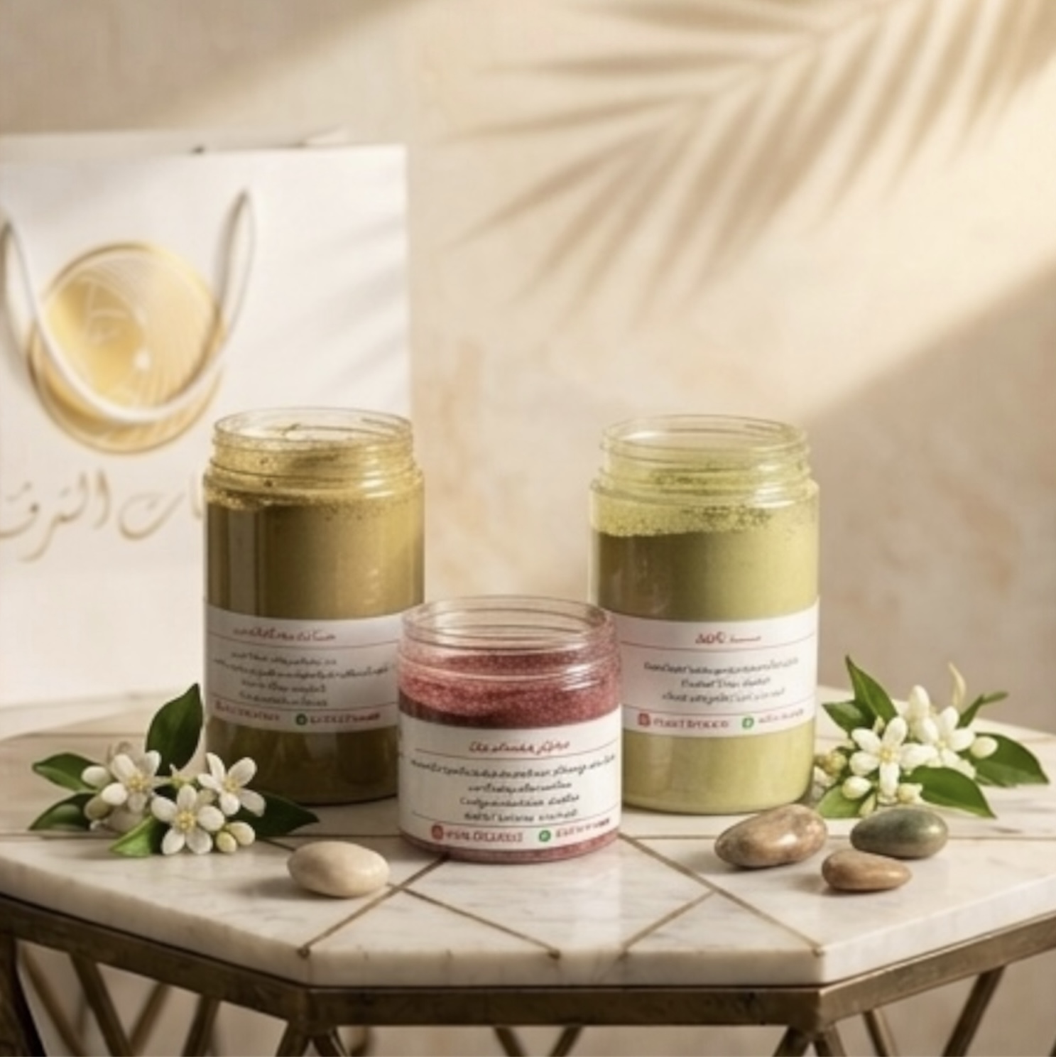 يتكون من :صابونية ترف بياض الثلجتبريمة ترف المغربيةكريم الجسممقشر العروس سنفره مع صابونيه