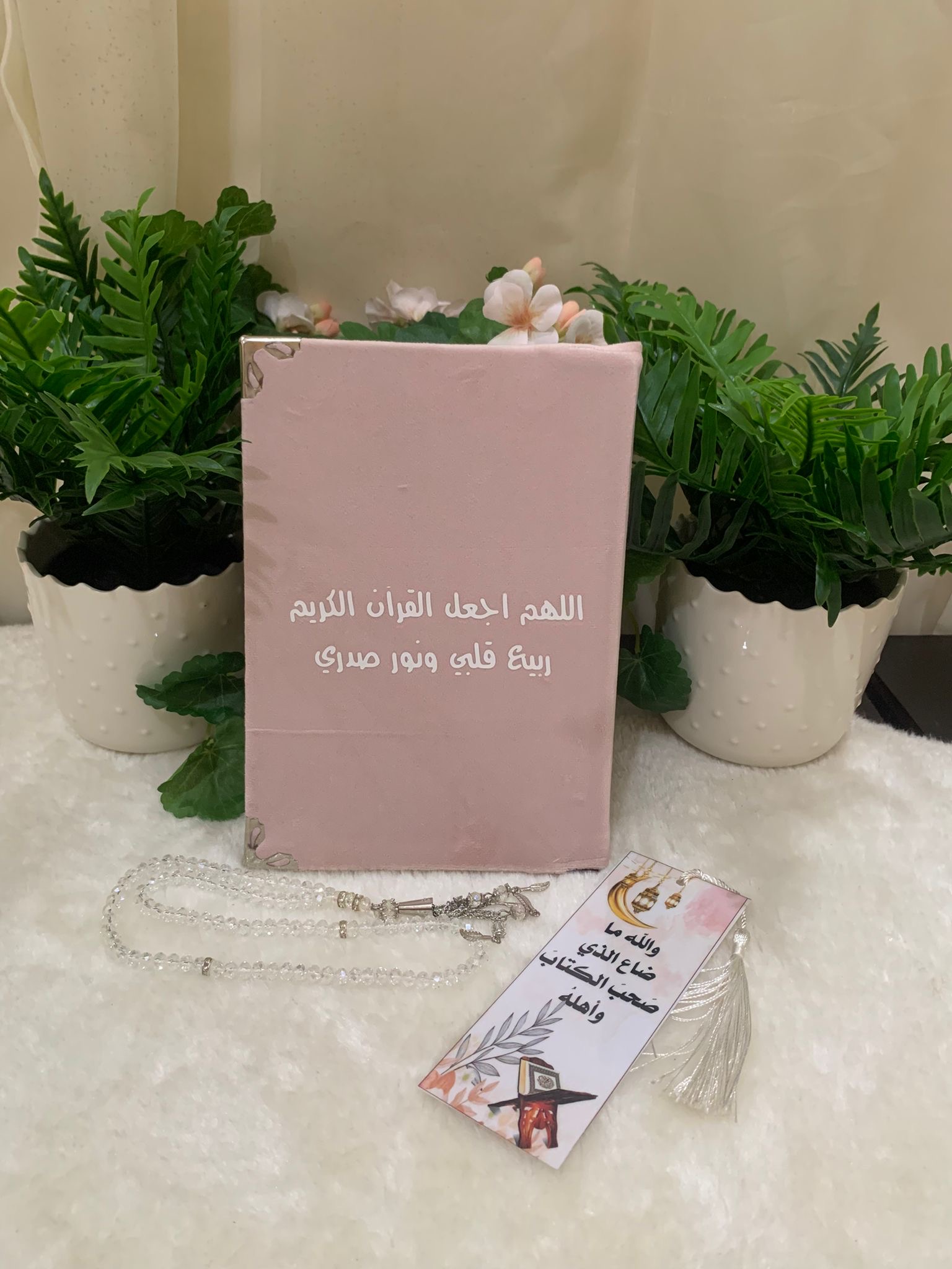 بوكس يتكون من مصحف مغلف ومسباح وفاصل قرأن الون وردي فاتح