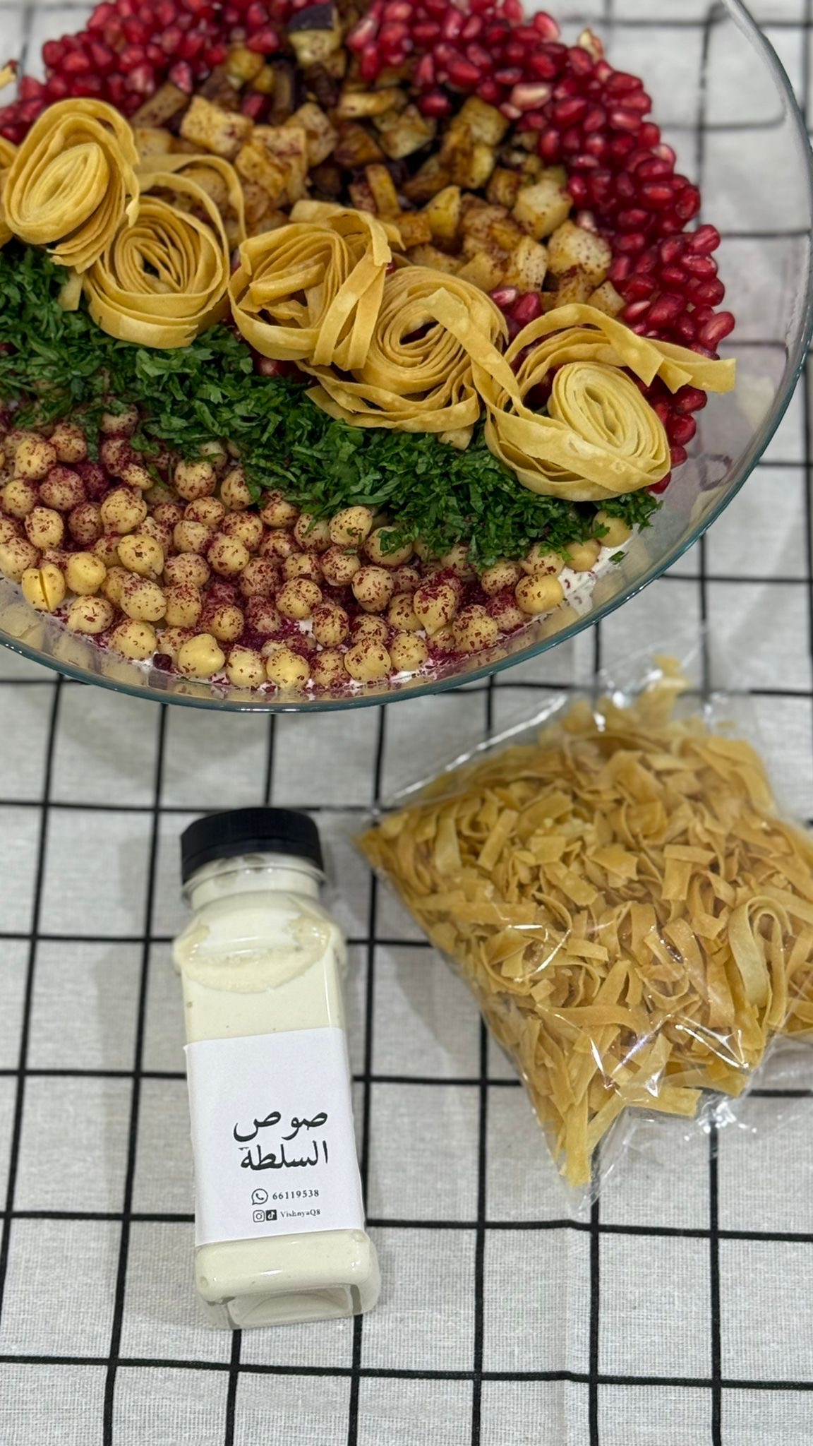 سلطة فته الباذنجان حجم كبير يكفي ٨ الى ١٠ اشخاص مع صوص سلطة اضافي وخبز اضافي